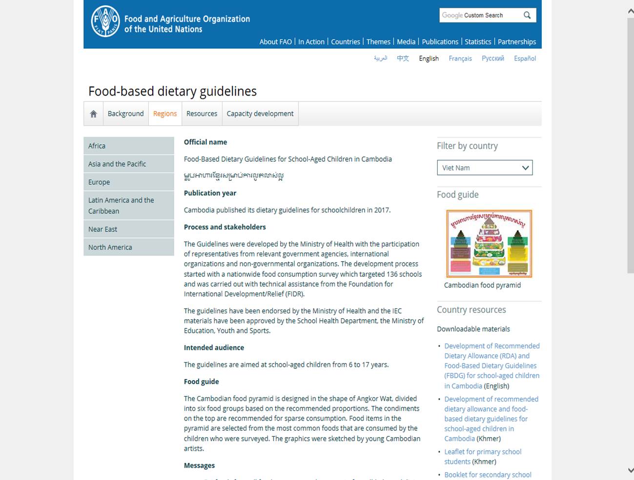 カンボジアは食生活指針が長く不備の状態でしたが、保健省の要請のもと当事業により昨年ようやく完成し、保健省の認定を受けることができました。このたび、その「カンボジアの学齢期の子どもたちのための食生活指針」がFAOのサイトに掲載され、リストにカンボジアの国旗が追加されました。これは、この指針が調査と解析という科学的根拠に基づき、国際的に定められたガイドラインに沿って作成されたものとして認められたことを意味します。