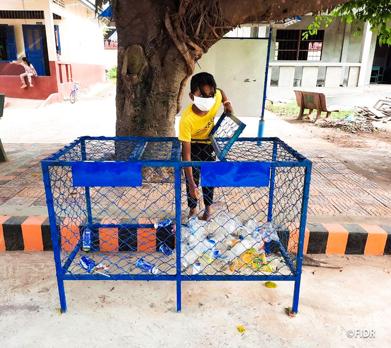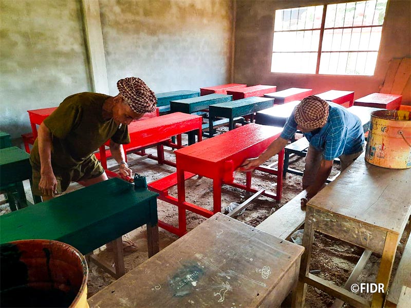 モデル校の一つであるラヴィエテ小学校では、校長先生が地域の住民やお寺の協力を募り、新しい校舎の建設を始めました。学校が再開して子どもたちが戻ってきた時に、楽しく勉強できるよう、机も色鮮やかに塗装しました。また、これまではあらゆるゴミを一緒にして焼却していましたが、缶やペットボトルを分別できる回収ボックスも設置しました。