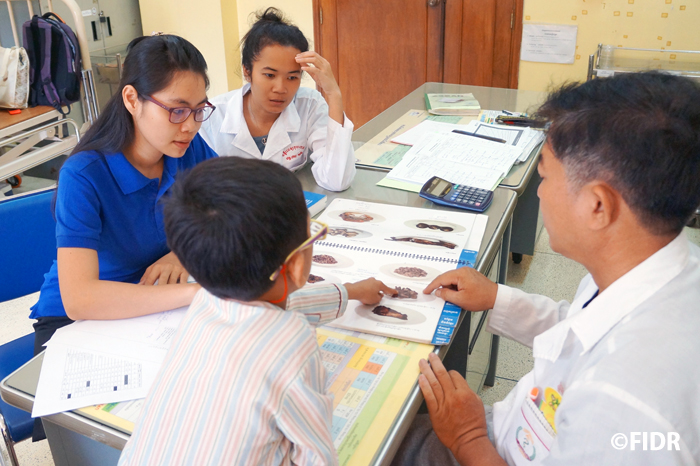 10月に入り、ロン君は前日の食事を記録した用紙を持って来院しました。そして、カンボジアの食品の写真を収めた本※を見ながら、パゥ医師からの質問に次々と答えていました。診療の結果、体重に大きな増加は見られなかったものの、9月の通院時には欠食しがちだと言っていた朝食もしっかりと食べていることが分かりました。