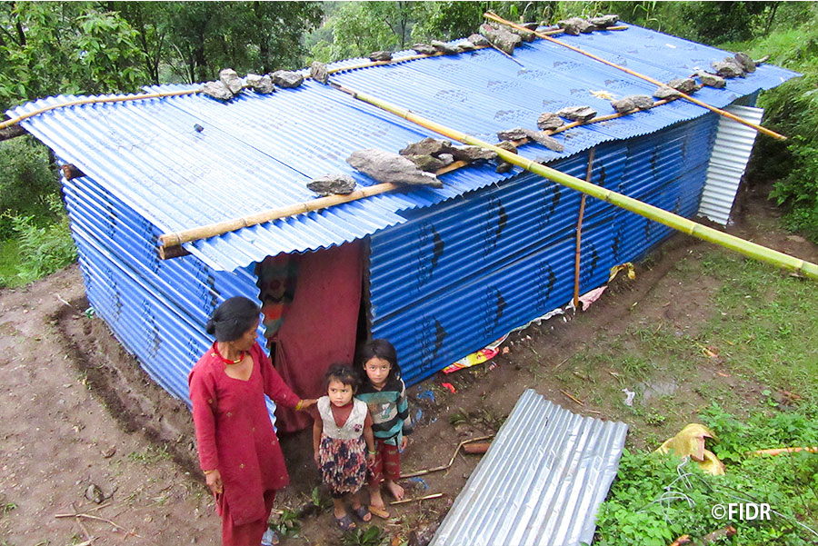 7月中旬、FIDRは活動地の一つであるラメチャップ郡ベタリ区で大雨による土砂崩れと洪水から大きな被害を受けた67世帯に対し、食糧、衛生品、資材を提供しました。その後、家屋が全壊した19世帯は支援物資のビニールシートやトタン板を使い、近隣の住人らが提供してくれた土地に簡易的な住居を建て、仮暮らしを始めました。