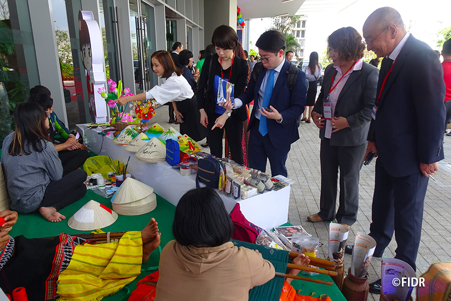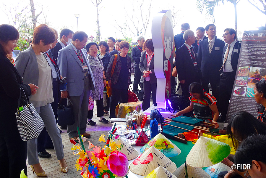 訪問期間中に開催された観光や投資の促進に向けたシンポジウムでは、クァンナム省を代表する伝統文化として、FIDRが振興を支援してきた少数民族カトゥー族の織物「カトゥー織」が紹介され、カトゥー族の女性たちは、二階幹事長、フック首相臨席の下、カトゥー織の実演を行いました。FIDRはベトナムで活動をしているNGOの中で唯一シンポジウムへの招待を受け、カトゥー族の人々と一緒にカトゥー織や織物製品を展示販売しました。