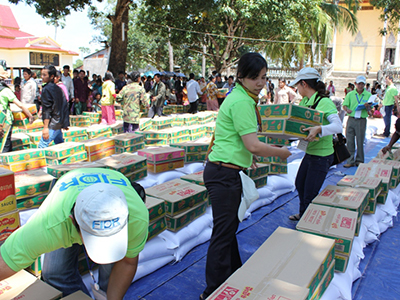 コンポンチュナン州3郡における洪水被災者7,548世帯と、小学校に通う児童約550人