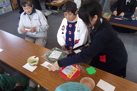 昨年5月、宮城県石巻市内の仮設住宅大橋団地集会所にて、石巻商業高等学校茶道部の皆さんが団地にお住まいの方々をお招きしてボランティア茶会を開催しました。6人の女子部員は着物姿で参加し、お茶やお菓子を振る舞いながら地域の方と交流しました。