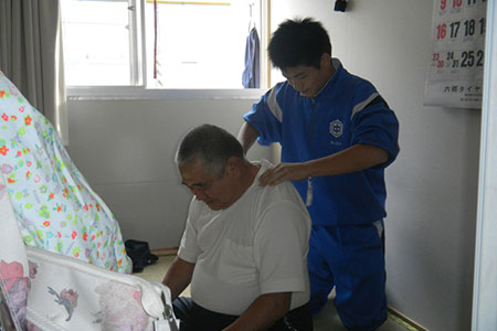 今、自分たちができる、地域のためになる活動として「緊急搬送の実演演習」「花壇の整備」「仮設住宅入居者の血圧測定」「福祉施設の方々との交流」「復興にむけての語り合い」など、10のコースに分かれて行ないました。生徒さんたちにとって、震災を体験した今年は、例年とは違った想いがめぐったようです。