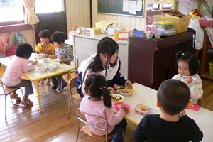 9月1日、岩手県大船渡市立日頃市(ひころいち)中学校の1、2年生31名が、津波の被害を受けた大船渡保育園の子どもたちを元気にしたいと、一緒に遊んだり、お昼ごはんやお昼寝の世話をしたりするボランティアを行いました。
