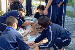 10月12日、大船渡市立日頃市中学校の2年生のみなさんは、同市盛小学校のグラウンドに建設された沢川応急仮設住宅を訪れました。目的は仮設住宅で生活する方々と協働してのベンチづくり。仮設住宅に住んでいる大工さんからのご指導を受けながら、技術家庭科の授業で学んだ技術をフル活用し、りっぱなベンチを完成させました。
