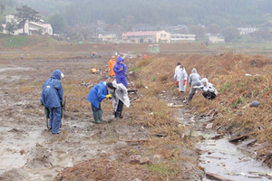 2012年5月8日、岩手県内陸部より盛岡市立高等学校1年生のみなさん総勢320人が大槌町を訪れ、海岸の清掃、側溝の泥出しなどのボランティア活動を行いました。体力のいる作業を、コツコツとやる中で、改めて震災について、そして自分たちができることについて考える機会となったようです。