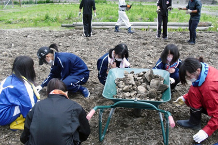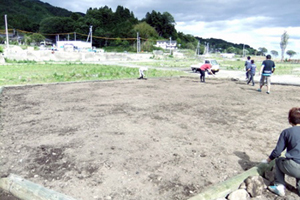 大船渡市: ボランティアセンターの指示により、合計24名の生徒、保護者、教員が仮設住宅近くの公民館の敷地を整地しました。石や木を取り除く作業をしていると仮設住宅に住んでいる子どもたちが手伝いに来てくれたり、大人には「ありがとう」「本当にうれしい」などの声をかけてもらい、疲れがとれてやる気がでたという生徒もいました。被災地に行って元気になってもらうつもりが逆に元気をもらったと言いたくなる気持ちがよくわかったとの感想もありました。