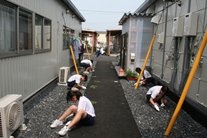 「仮設住宅の草抜きボランティアで最初に思ったのが、住宅一つの大きさがあまりないことです。小さな仮設住宅の中で生活するのは、とても大変なことだと思いました。」