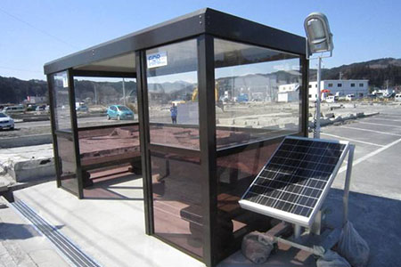 FIDRの仲立ちで企業から山田町へ無償で貸与していただいたソーラーライト2基もこの停留所に設置しました。町内に街灯がまだ少なく夜間は真っ暗となるため、停留所を利用する女子の安全が懸念されるためです。