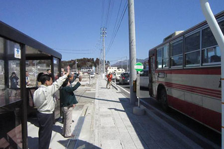 山田町では、津波により駅や線路が被災したため、現在は住民にとってバスが最も重要な公共の足。国道45号線沿いの町の中心部、役場の近くに位置している「山田中央町」停留所は、岩手県北バスが毎日30便ほど停車します。一日に平均して200人もの利用者がありますが、待合室はありませんでした。周囲の建物が津波でほとんど無くなってしまったため、お年寄りや中高生が、海から吹きすさぶ強風や雨雪の中でバスを待つ姿がありました。