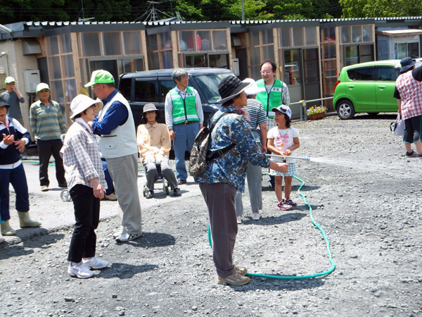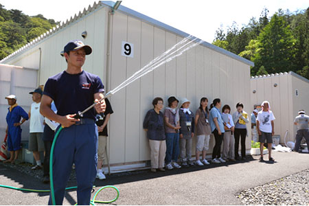 取扱い説明会は、7月31日に山田町、8月1日に大槌町の各3か所で行われ、設置される仮設住宅団地の代表の方が集まりました。東北とはいえ、厳しい炎天下での説明会。参加者全員、日陰に隠れても滝のような汗をかきながら、操作の説明を真剣に聞かれていました。演習では、参加者全員が順番に放水を体験し、女性でも簡単に扱えることを感得しました。