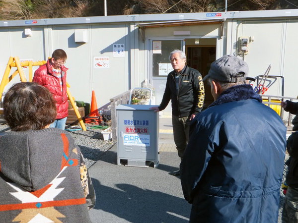FIDRは昨年、岩手県山田町と大槌町の合わせて20か所の仮設住宅団地に、「簡易水道消火装置(街かど消火栓)」の設置を支援しました。これは、消防車が到着するまでの間に、手近な水道を用いて、住民の方が初期消火活動を行う設備で、住民の方々が自ら安全を確保できるよう支援したものです。
