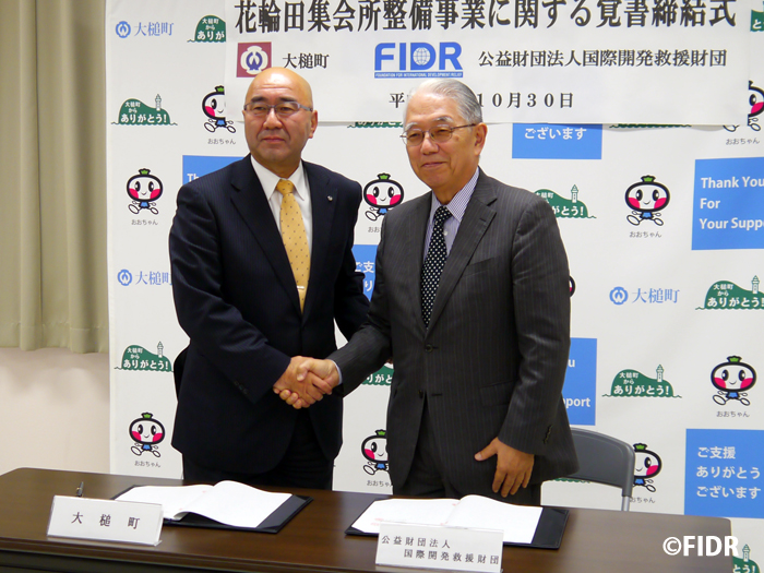 10月30日、岩手県大槌町役場にて、「(仮称)花輪田集会所整備事業に関する覚書締結式」が行われました。式には平野大槌町長、FIDR江川常務理事に加え、花輪田地区の自治会役員の方々も出席されました。