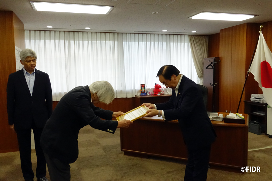 このたび、東日本大震災の被災地の復興に向けたFIDRの取り組みと貢献が評価され、渡辺博道復興大臣より感謝状が贈呈されました。