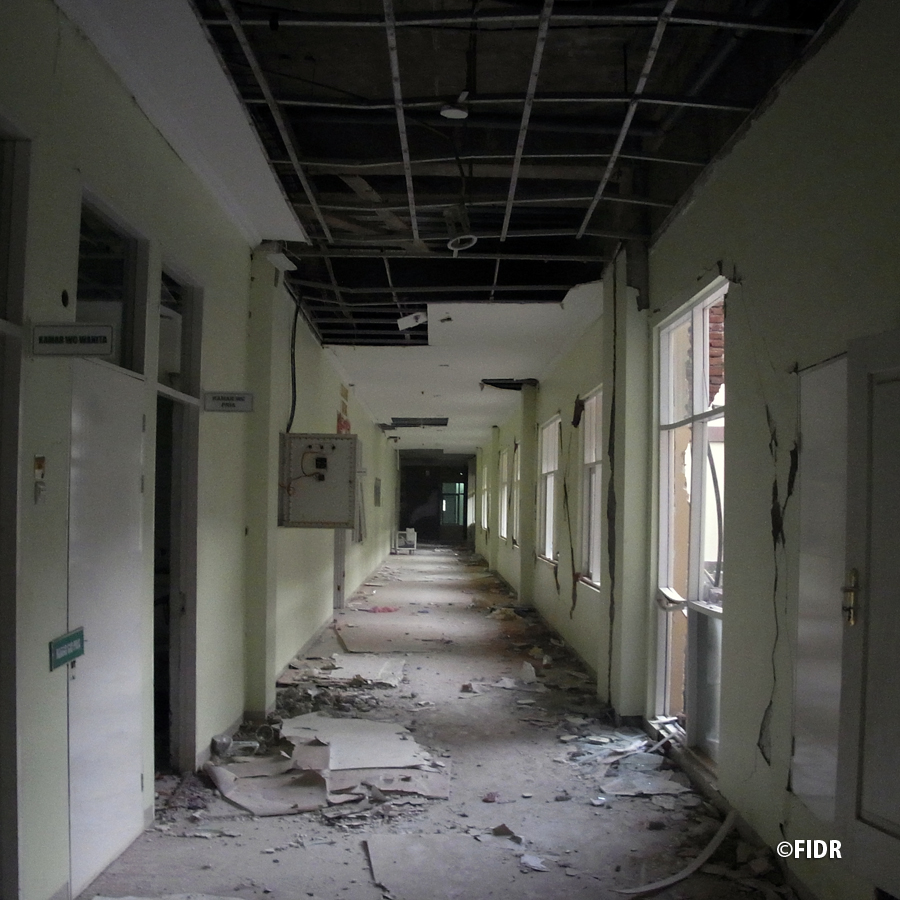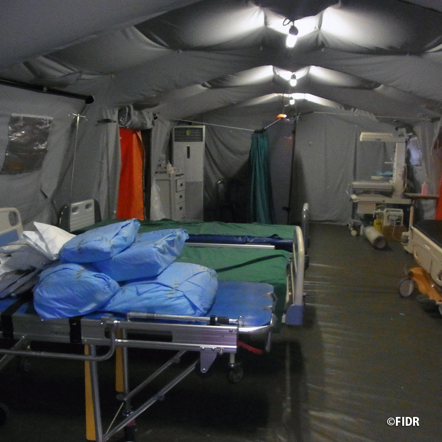 今や天井が崩壊し、壁の亀裂も多いために危険と判断され、病院機能は屋外に建てられたテントの中に移りました。