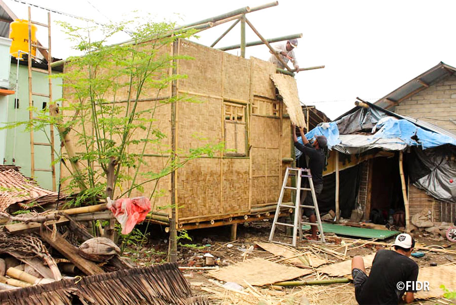 FIDRが支援する仮設住宅は、日本のようなプレハブ造りの建物ではありません。高温多雨の現地の気候に合うよう風通しがよく、かつ現地の資材と技術を用いて安価に設置できることが大切であることから、ロンボク島の丘陵部に豊富にある竹材を使って作ります。この仮設住宅は、耐久性も居住性も備え、人々が自宅を再建するまで十分に役立つと考えます。