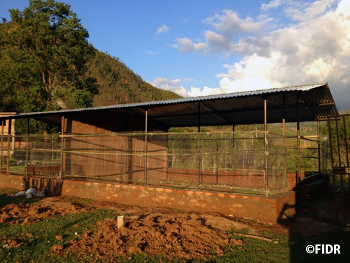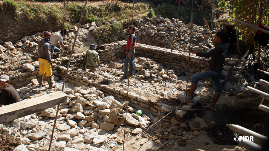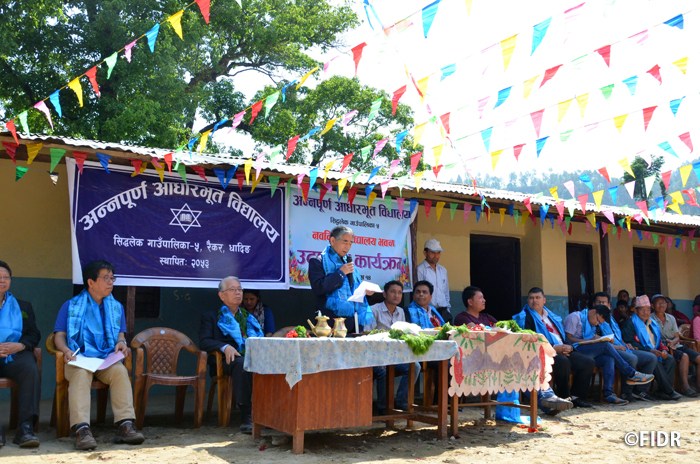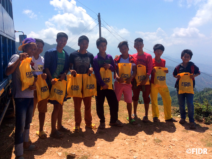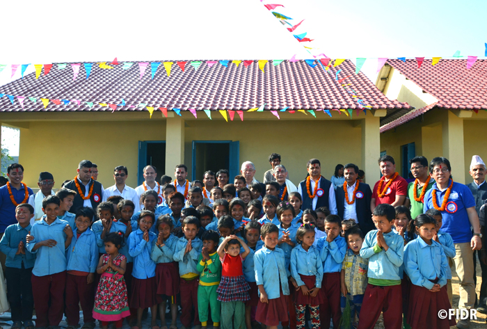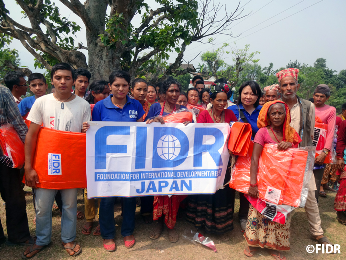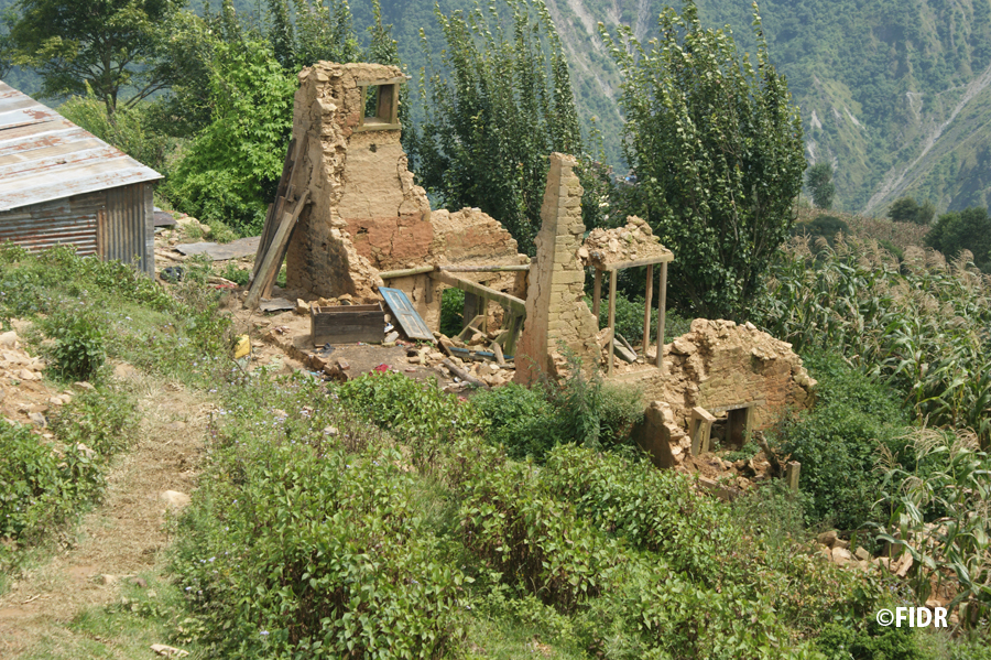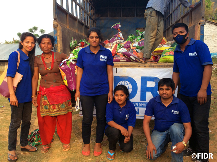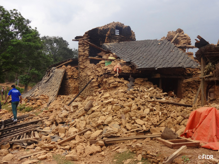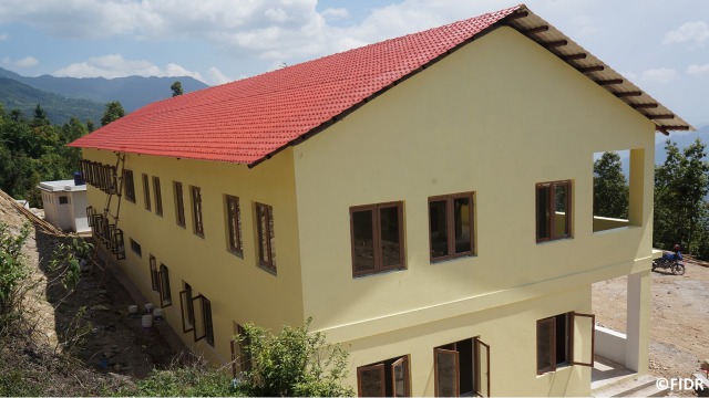 FIDRは2015年のネパール大地震後、被害が大きかったダーディン郡の住民に対し食糧や防水シート、衛生用品を配布するなど緊急援助活動を行いました。また、多くの学校が倒壊し子どもたちが授業を受けることができない状況だったため、応急的な仮設教室を建設し、その後、同郡で5校の学校校舎を再建しました。