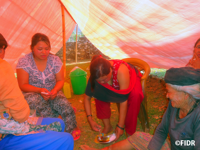大震災から18日目の5月12日、ネパールは再び強い余震に襲われました。そのとき、FIDRチームはカトマンズから車で4時間かけ、ダーディン郡の郡都ダーディンベシに到着し、昼食を取り終えたところでした。揺れに気付き、すぐにレストランの裏庭に避難。余震におびえる日々を送っているネパール人女性たちの中にはパニックに近い状況になり、座り込んでしまう人も見受けられました。