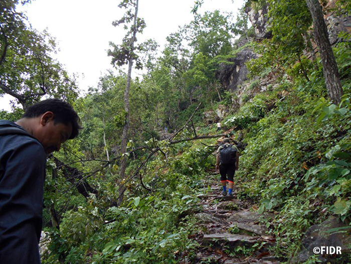 先日も、少し晴れ間が見えたので「もしかしたら車両が通れるのではないか」と淡い期待を抱き車で現地へ向かったのですが、やはり通行できませんでした。そのためFIDRスタッフは同行した建設コンサルタントの方々と共に徒歩で近道(という名のけもの道)を探しながら山を登り、建設地へと向かいました。