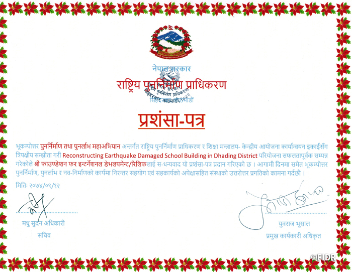 昨年12月にFIDRは、ネパール政府復興庁(※)より、震災復興支援への貢献に対する感謝状を授与されました。