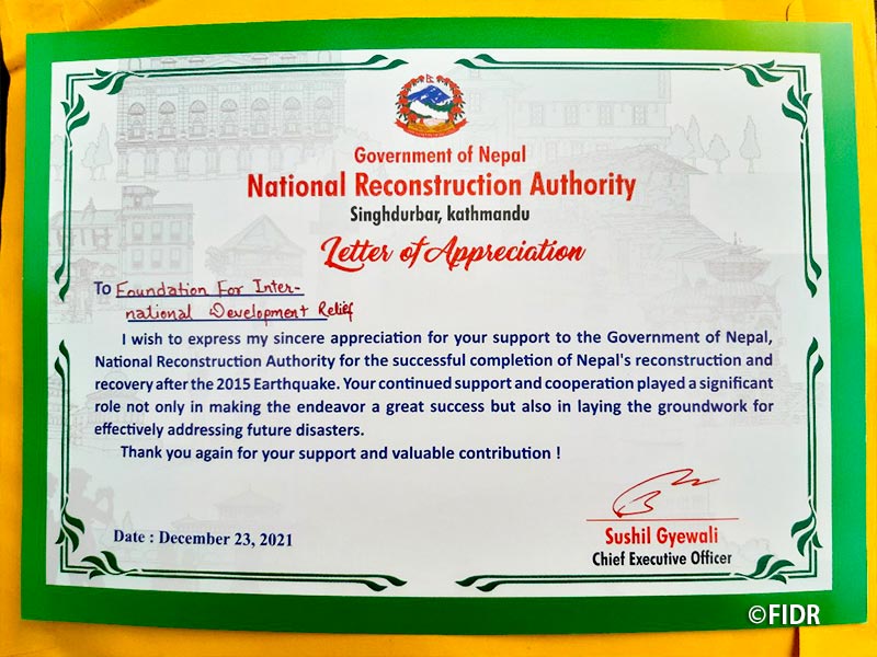 この度、2017年に続き二度目の感謝状を復興庁より受領し、これまでのFIDRの復興支援の成果が改めて認められたことは、FIDRネパール事務所スタッフにとって大きな喜びとなりました。