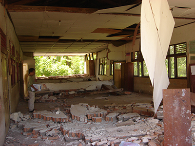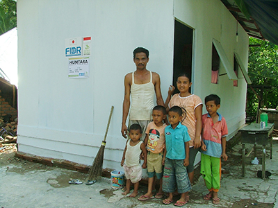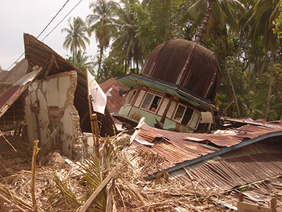 FIDRは、震災発生から1週間後に現地入りし、パダン市とその近隣地域での調査を行いました。被害の大きかった山間部の家屋は、柱を持たないコンクリートの壁で屋根を支える構造のものがほとんどであるため、押しつぶされたような形で崩壊している家屋が多数あり、被災者はかろうじて残った建物の中で不安な中での生活を送っていました。