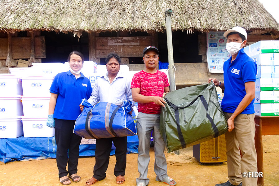タイヤン郡は、高地部を中心に土砂崩れの爪痕が残ったままで、物資を配布する村々への道も寸断されている状態でした。FIDRは、家屋が浸水・倒壊した71世帯に毛布、ハンモック、米・干物等を、家屋が損傷したり家財を失ったりした287世帯には、防虫網、石鹸、ミルク等を手渡しました。また、今後の災害に備えて、スコップ、ロープ、ライト等のレスキュー・キット90セットをタイヤン郡の行政機関を通じて、郡内の村々に配布しました。
