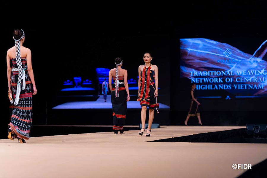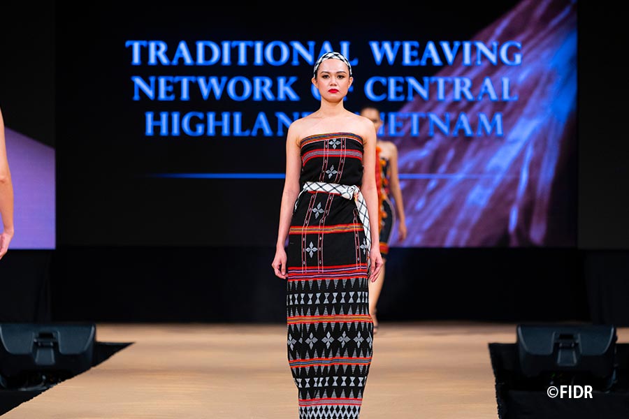FIDRは約20年にわたり、ベトナム中部少数民族の伝統織物の生産と、その販売拡大による収入向上を支援してきました。この伝統織物は2014年にベトナムの無形文化財となり、2019年には中部の少数民族による織物ネットワークが立ち上がりました。今年は国際的なファッションショーやユネスコ無形文化財の国際会議にも取り上げられました。