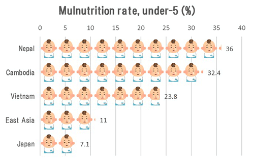 Average weight and height of Cambodian children are significantly lower than that of children in other Southeast Asian countries. In Cambodia, nutrition education is not incorporated in education curriculums and children hardly have an opportunity to learn about nutrition and meals.