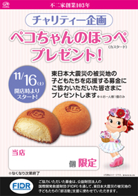 この企画は、全国の不二家洋菓子店(636店)の店頭で東日本大震災の被災地の子どもたちを応援する募金を呼びかけ、ご協力者に同社商品「ペコちゃんのほっぺ」をプレゼントするというものです。当日、店頭には募金箱と募金の趣旨を示すポスターが設置され、販売員の方々がお客様へ募金への協力をお声がけしました。