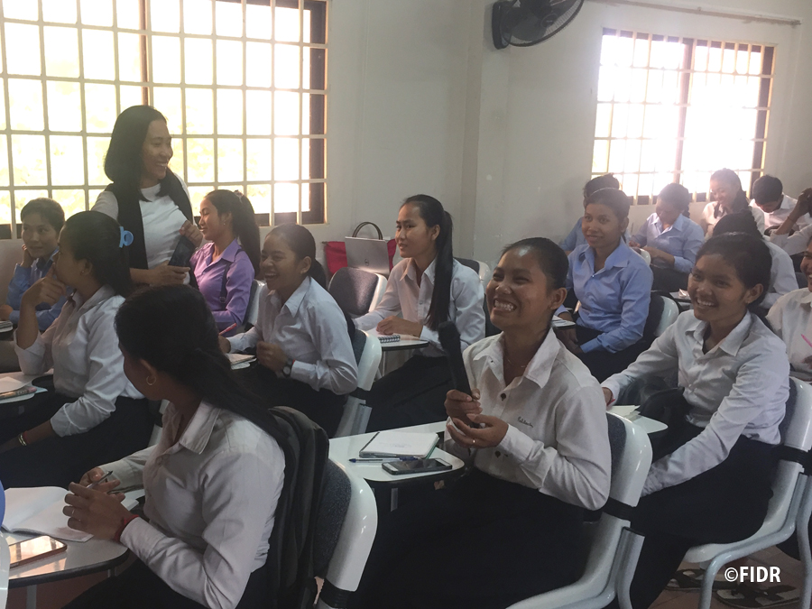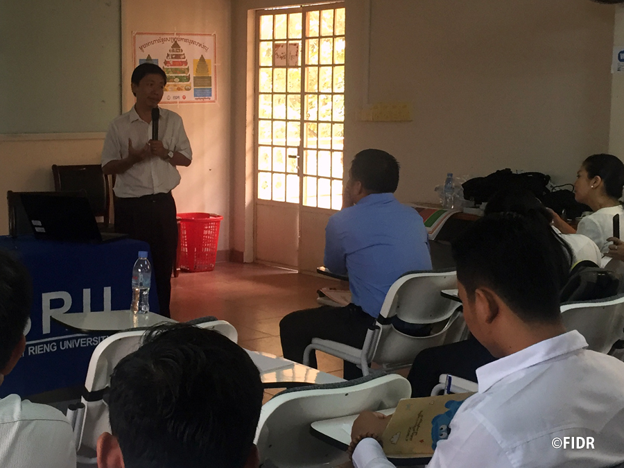 現在、カンボジアの大学では、栄養の学科課程はなく、基礎から学べる教育機関もほとんど存在していません。そんな中、なぜこのワークショップが開催されることになったかというと、昨年10月に日本を視察した教育・青年・スポーツ省学校保健局のソカ氏が、栄養教育の大切さや日本で学んだことを広めたい、という希望からでした。栄養をテーマに自ら学生に話をしたい、と大学の方に提案、相談し、実現に至りました。そして、実際に大学で栄養学を学んだ人にも話をしてほしい、ということで、FIDRの甲斐専門家も登壇することになったのです。