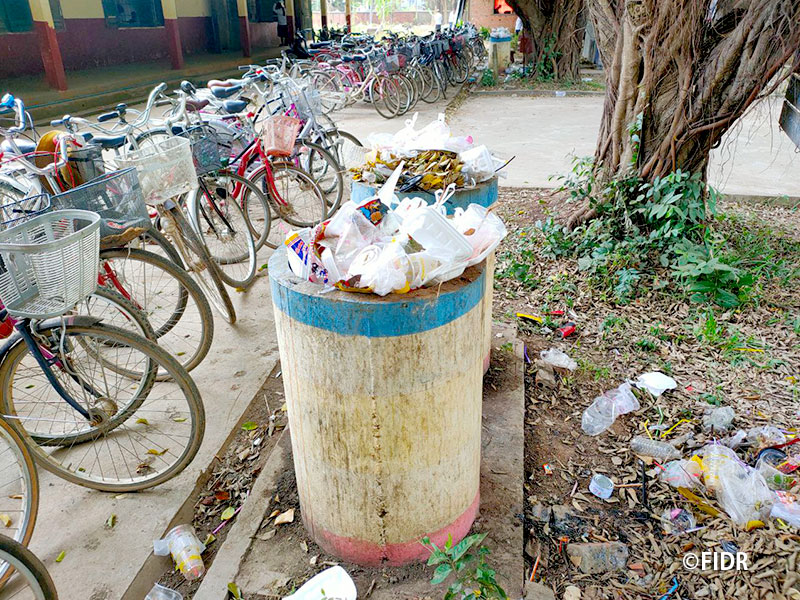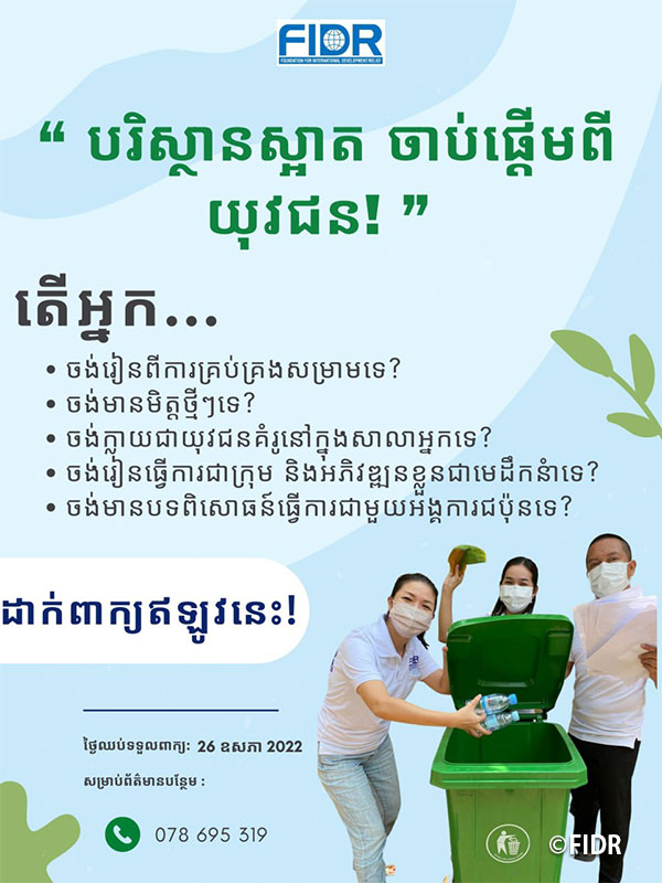 FIDRはこの栄養教育普及プロジェクトで、健康的な生活のためには衛生的な環境も不可欠であることを伝え、学校のゴミ処理の方法を改善するよう学校に働きかけてきました。食事内容やゴミの捨て方など、健康にかかわる子どもの習慣や行動は、子どもを取り巻く親や先生などの大人、また、友達に大きな影響を受けています。逆もしかりで、子どもたちの行動が、友達やその家族へ広がっていくこともあります。そこで、FIDRはモデル校で、子どもたちが主体的に学校のゴミ問題を改善すべく、この問題に一緒に取り組む学生を募集することにしました。