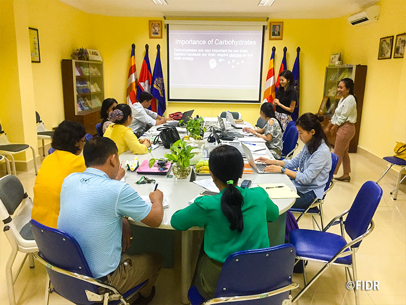 現在カンボジアには栄養士がいないばかりか、学校で栄養について学ぶ機会は皆無に等しいです。そのため、この「食生活指針」は子どもたちだけでなく学校の先生にとっても初めて触れる内容となります。指導用教材には指針の内容のみならず、基本的な栄養の知識や指導にも役立つようなトピックも含まれるように作成を進めています。FIDRのカンボジア人スタッフにとっても初めて知るようなことが含まれているので、皆で学びながらの作業です。