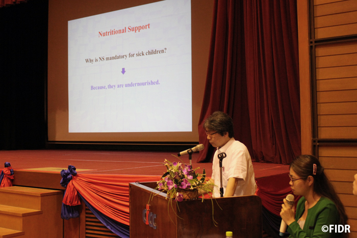 本セミナーでは、NPHで実施されている栄養管理の現状と症例の発表や、『小児患者栄養管理マニュアル』の発表を行いました。当マニュアルは、栄養管理を概論し、NPHにおける栄養管理システムをその事例として紹介するもので、カンボジア初の栄養管理の教科書とも呼べるものです。FIDRとNPHの医師が共同で作成しました。また、日本の近畿大学医学部奈良病院から子どもの栄養管理に精通された小児外科医師2名もセミナーに招き、日本の小児栄養管理についてご紹介いただきました。