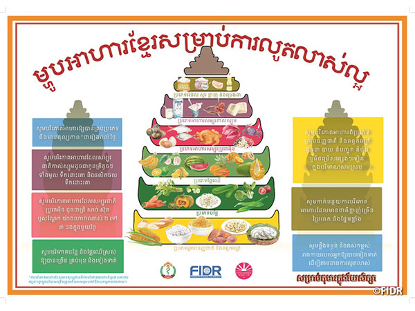 FIDRはカンボジア給食支援プロジェクトで、2014年より学齢期の子どもの「推奨栄養所要量」とこれに基づく「食生活指針」の策定を保健省や教育省、国際援助機関からなるワーキングメンバーと進めました。これは、献立例、食習慣改善の呼びかけ、教育教材、モニタリング評価方法などをまとめたカンボジアで初の科学的根拠に基づく栄養改善指針で、2017年11月には保健省より国のガイドラインとして認定されました。国連食糧農業機関(FAO)のウェブサイトでも紹介されています。