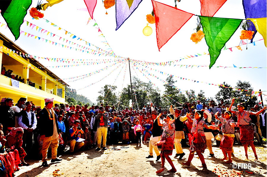 雨季明けを待ち、11月6日に両校の完成記念式典が催されました。日本からは本事業のご支援者を主賓に、FIDR神長評議員、岡田事務局長が迎えられ、地元住民から盛大な歓迎を受けました。ネパール政府側からは、教育省、社会福祉評議会、郡事業実施局、地域行政長官らが列席しました。学校関係者や多くの地域住民も出席し、地域を挙げて学校の完成を祝いました。
