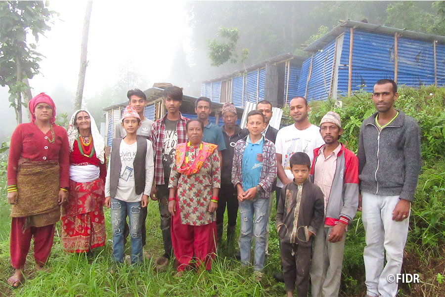 7月中旬、FIDRは活動地の一つであるラメチャップ郡ベタリ区で大雨による土砂崩れと洪水から大きな被害を受けた67世帯に対し、食糧、衛生品、資材を提供しました。その後、家屋が全壊した19世帯は支援物資のビニールシートやトタン板を使い、近隣の住人らが提供してくれた土地に簡易的な住居を建て、仮暮らしを始めました。