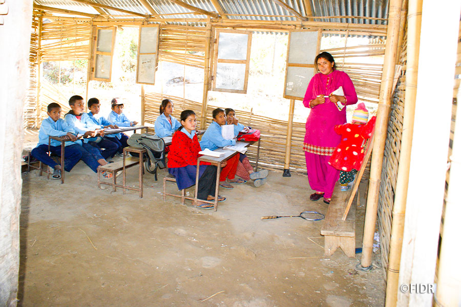 これらの学校は、2015年の大地震で大きな被害を受け、地震後に設置された竹製の仮設教室を今も使用しています。ビニールシートで覆うなどの工夫はしているものの、教室には風雨が吹き込みます。