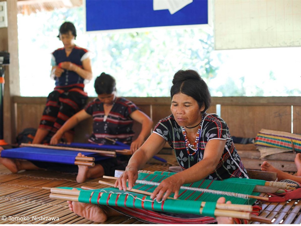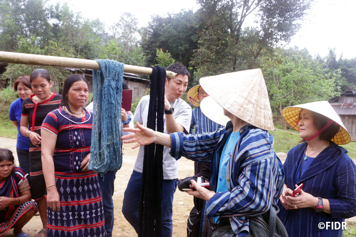 FIDRは、2008年から4年間かけてベトナム中部クァンナム省ナムザン郡のカトゥー族の女性たちを支援し、失われつつあった伝統織物技術の継承と、織物の商品化に努めました。2011年には、この女性たちが主体となり、クァンナム省として初めて、少数民族による織物協同組合が発足。彼女たちの村は「伝統手工芸村」として登録され、カトゥー織は2014年に国の無形文化財となりました。現在も、カトゥー織を活用した様々な商品を製作・販売し続けており、メディアによってベトナム国内で活動が知られるだけではなく、海外からもカトゥー織のうわさを聞きつけ、訪問する人たちも増えてきました。