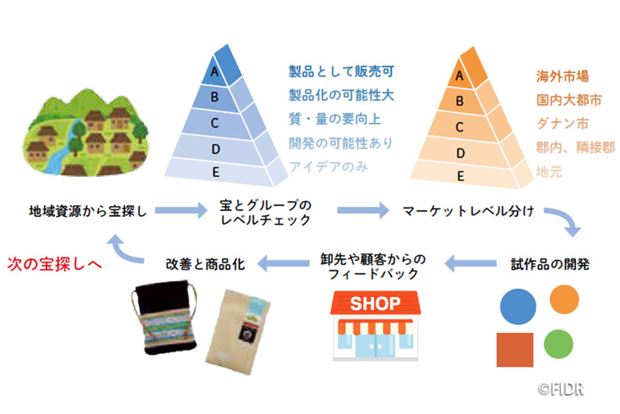 住民が発掘した宝はABCDEの5つのレベルに分類され、それぞれの商品が挑戦しやすいマーケットにすぐに挑めるよう工夫しました。4年の間、住民は、「発掘した資源(=宝)が商品になったあとも、マーケットからのフィードバックを受け、常により良いものをつくる」というサイクルを無数に繰り返しました。