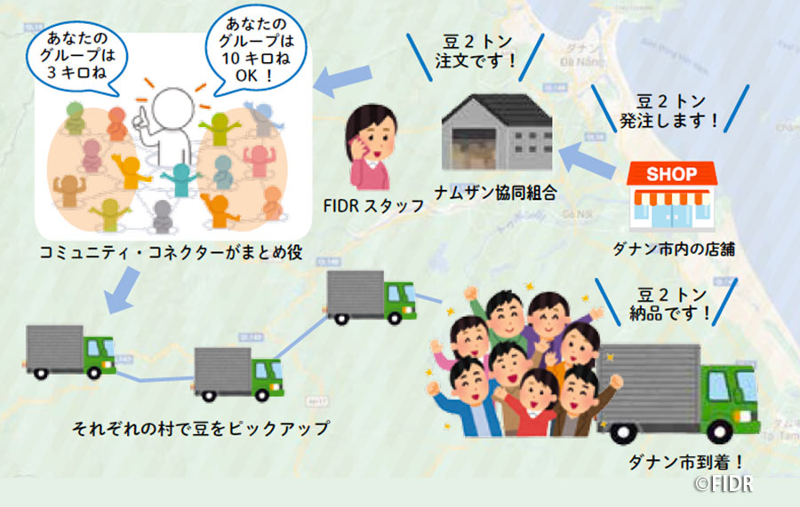 この発注を受けた後、FIDRのスタッフ、ナムザン郡の協同組合や地域を繋ぐ役割をしているコミュニティ・コネクターたちも、一気にスイッチが入ったかのような動きを見せ、多くの村々に声をかけ始めていました。村の人々には、きちんと練習を繰り返してきた通りに異物を取り除き、マメを選別、磨くことを指示し、コネクターたちは、すでに移動制限が発令されており通常のミニバスが使えない中、(こっそりと)レンタカーを手配し、村々でマメを集荷してもらい、(うまく)ダナンに配送という交渉もしました。このような、見事な短時間内での超連携プレーの連続で、納期に無事に間に合わせるという妙技を発揮してくれたのです。FIDRスタッフ全員、「お見事!」という言葉しかでませんでした。