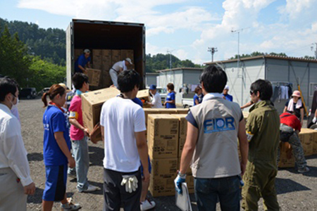 気温30度を超す炎天下にも関わらず、約40人のボランティアさんの協力により、大型トラック4台分の支援物資を、全世帯に確実に手渡すことができました。入居者の皆さんは支援物資に喜んでくれただけでなく、協力してくれた日本体育大学学生のハツラツとした動きと挨拶に、「とにかくなんとかしたい、力になりたい」という熱い想いも一緒に受け取ってくれたようでした。入居者の方から、お礼としてジュースやアイスクリームをいただいて喜んでいた、大学生の笑顔が印象的でした。