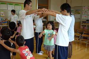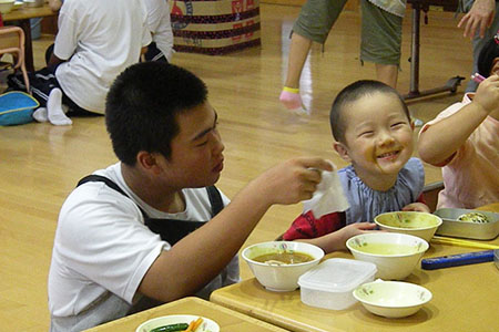 9月1日、岩手県大船渡市立日頃市(ひころいち)中学校の1、2年生31名が、津波の被害を受けた大船渡保育園の子どもたちを元気にしたいと、一緒に遊んだり、お昼ごはんやお昼寝の世話をしたりするボランティアを行いました。