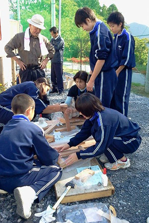 10月12日、大船渡市立日頃市中学校の2年生のみなさんは、同市盛小学校のグラウンドに建設された沢川応急仮設住宅を訪れました。目的は仮設住宅で生活する方々と協働してのベンチづくり。仮設住宅に住んでいる大工さんからのご指導を受けながら、技術家庭科の授業で学んだ技術をフル活用し、りっぱなベンチを完成させました。