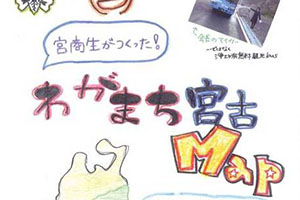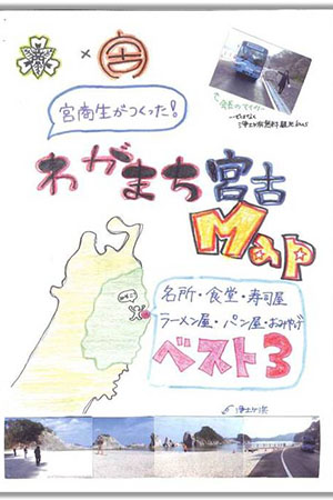 “宮商生がつくった、わがまち宮古Map”──自分たちの目で津波で流されてしまった街を見て、自分たちの耳で宮古の復興に向けて頑張っている人の声を聞き、自分たちが遠くからボランティアに来てくれる人たちと触れ合って、宮古商業高校の生徒会が中心となって作ったタウンマップです。宮商生が選んだ宮古おすすめの名所や食べ物屋さん、おみやげを紹介しています。