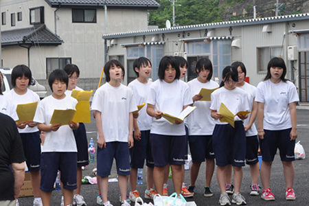 除草作業の後には、震災への祈りを込めて同校教諭が作詞作曲した「心をひとつに〜夢と希望と決意をもって〜」をアカペラで披露。涙を流し聞いて下さる方もいました。生徒のみなさんの応援メッセージは、しっかりと石巻の人たちの心に届きました。
