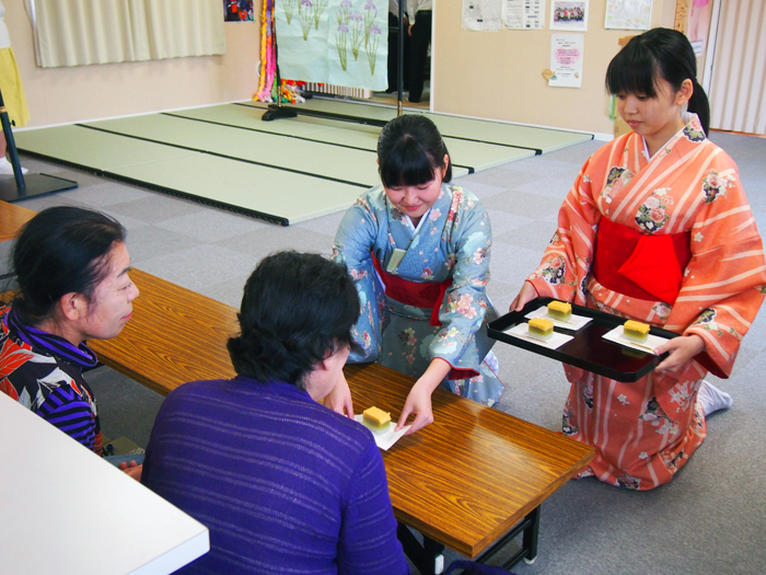 昨年5月、宮城県石巻市内の仮設住宅大橋団地集会所にて、石巻商業高等学校茶道部の皆さんが団地にお住まいの方々をお招きしてボランティア茶会を開催しました。6人の女子部員は着物姿で参加し、お茶やお菓子を振る舞いながら地域の方と交流しました。