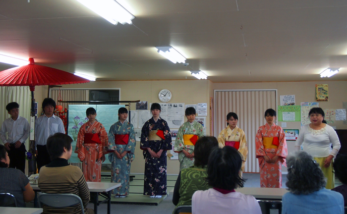 8月20日、宮古市実田の仮設住宅内の集会所で、被災者の方々においしいお茶とお菓子をふるまって元気になってもらおうと、同校茶道部によるお茶会が催されました。「自分たちにもできることを何かしたい」という部員一人ひとりの想いが、今回の活動を立ち上げました。