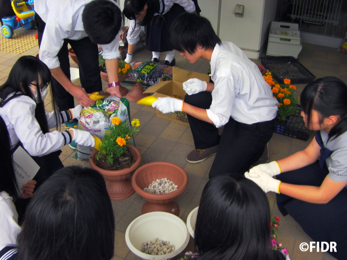 参加した生徒たちは釜石高校に集まり、季節の花をプランターに植え替え、花の寄せ植えを制作しました。その後、釜石市内の5ヵ所の仮設住宅を訪れ、お住まいの皆様にお配りしつつ、住民の方とふれ合いました。また、生徒たちは、震災の被害が大きかった大槌町を訪れ、大槌高校の生徒から震災当時の様子について説明を受けて、町の復興の様子を見て回りました。